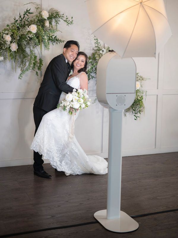 A sleek, all-white open-air photo booth with a clean, contemporary design—perfect for modern, elegant, and minimalist weddings. This booth blends effortlessly into upscale venues and bright spaces while capturing fun, high-quality photos and GIFs your guests will love.