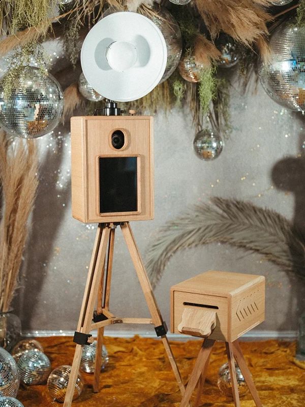 A warm, wood-finish open-air photo booth designed for romantic, boho, rustic, and garden-style weddings. This booth adds natural charm and character to your space while capturing fun, high-quality photos and GIFs your guests will love.